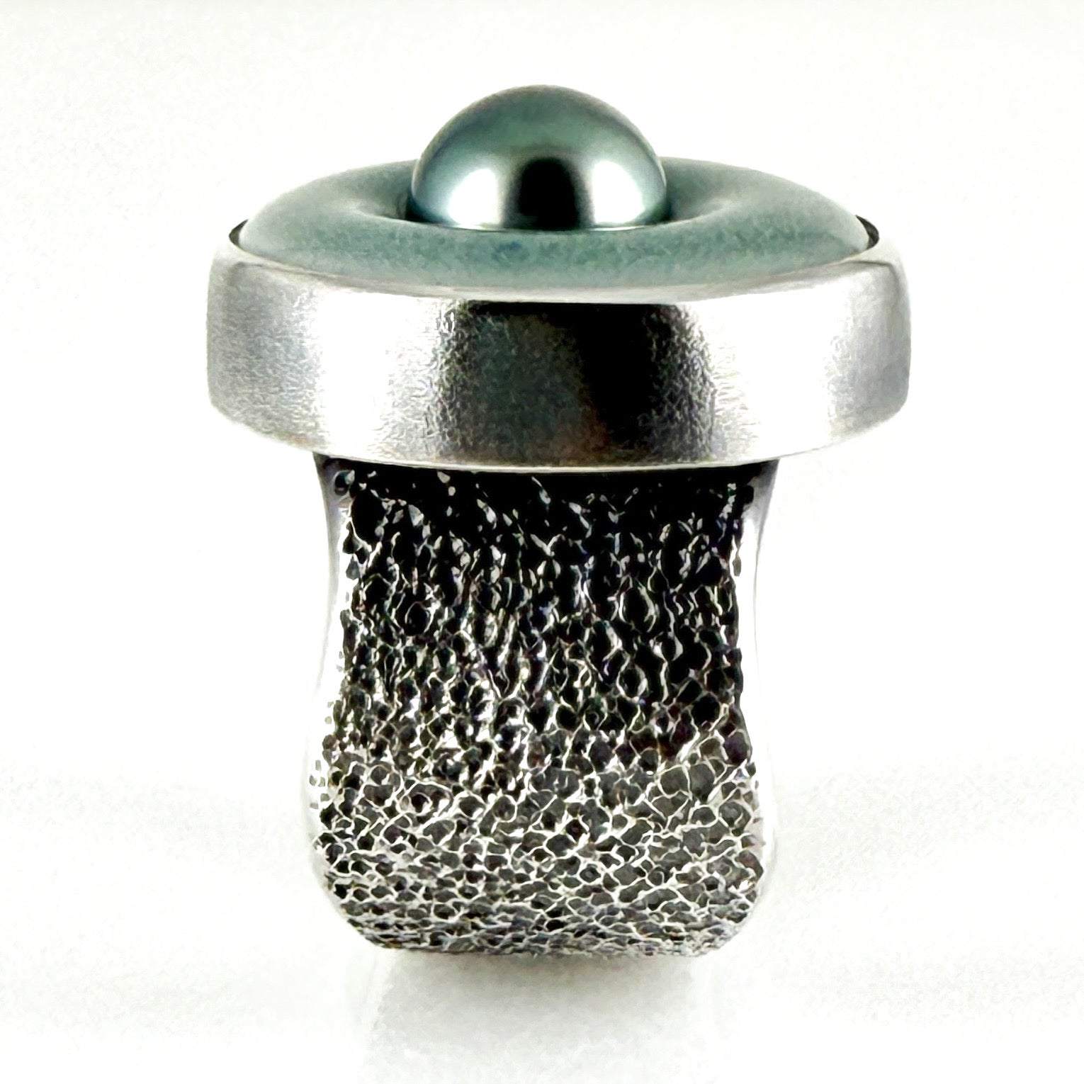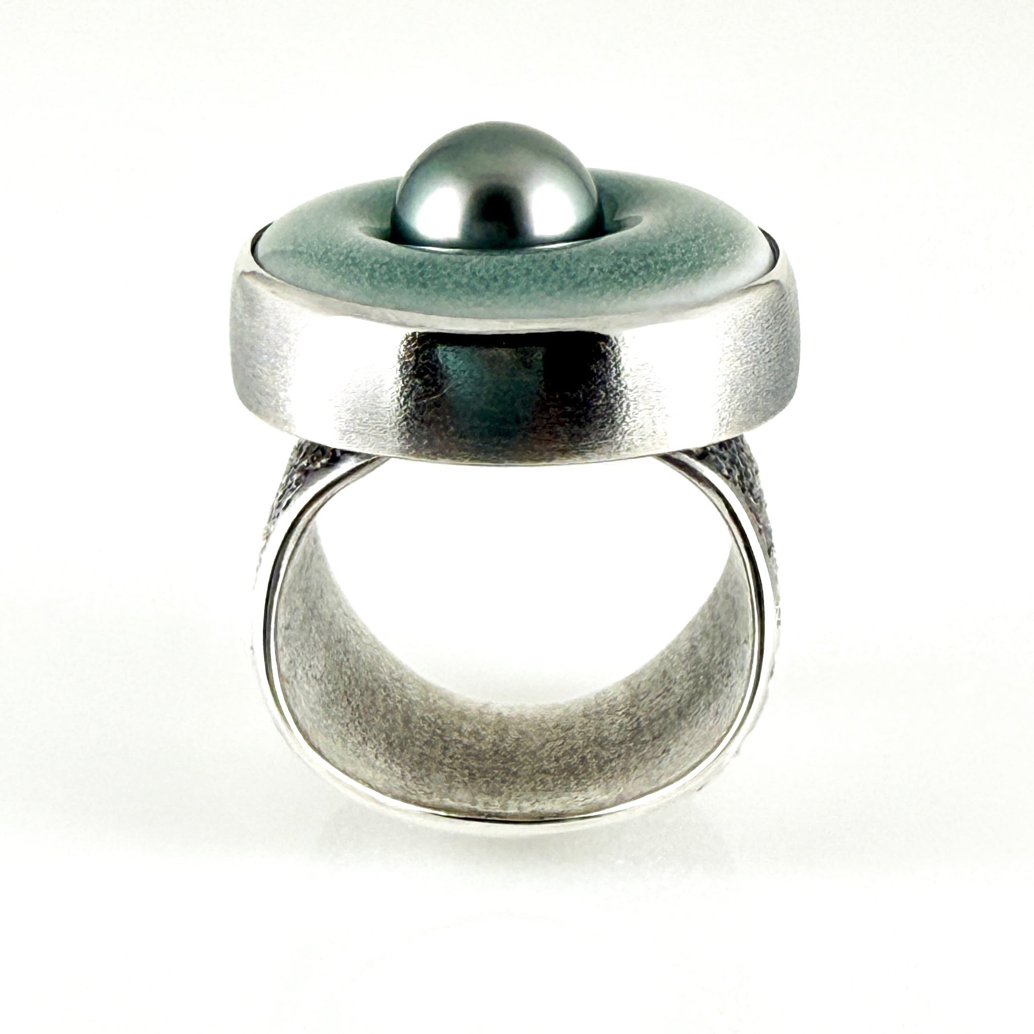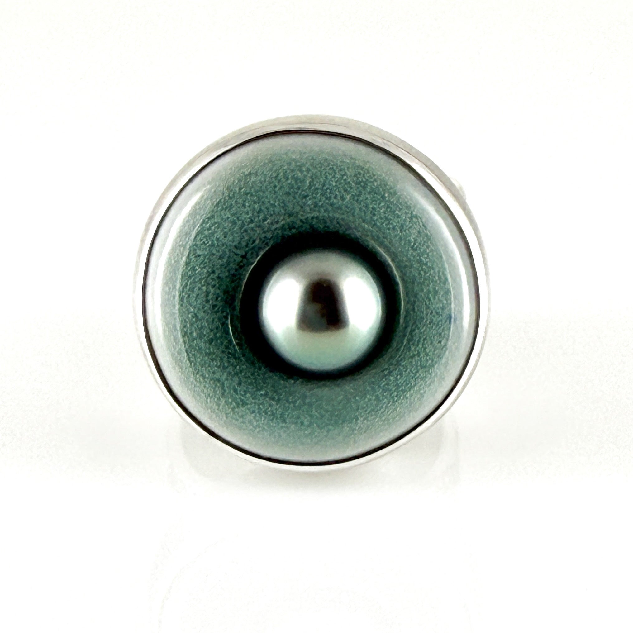 Graceful and feminine. This ceramic halo ring features a luscious grey~green Tahitian pearl. I love the extremely comfortable, sculptural, wavy stardust band.