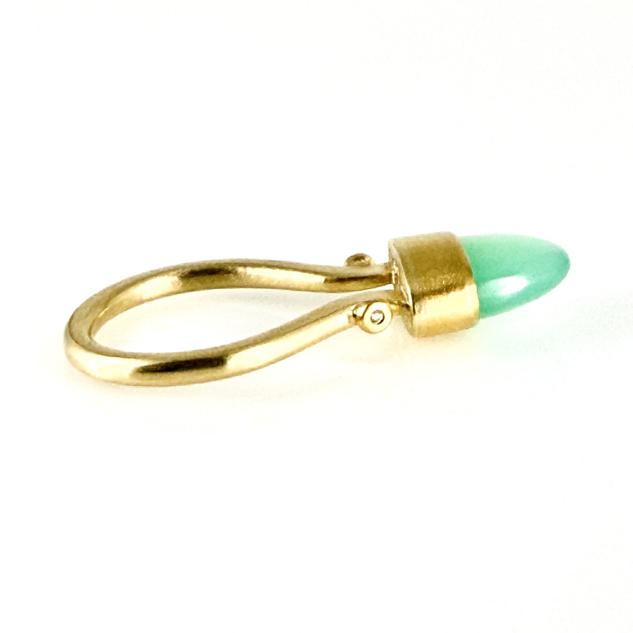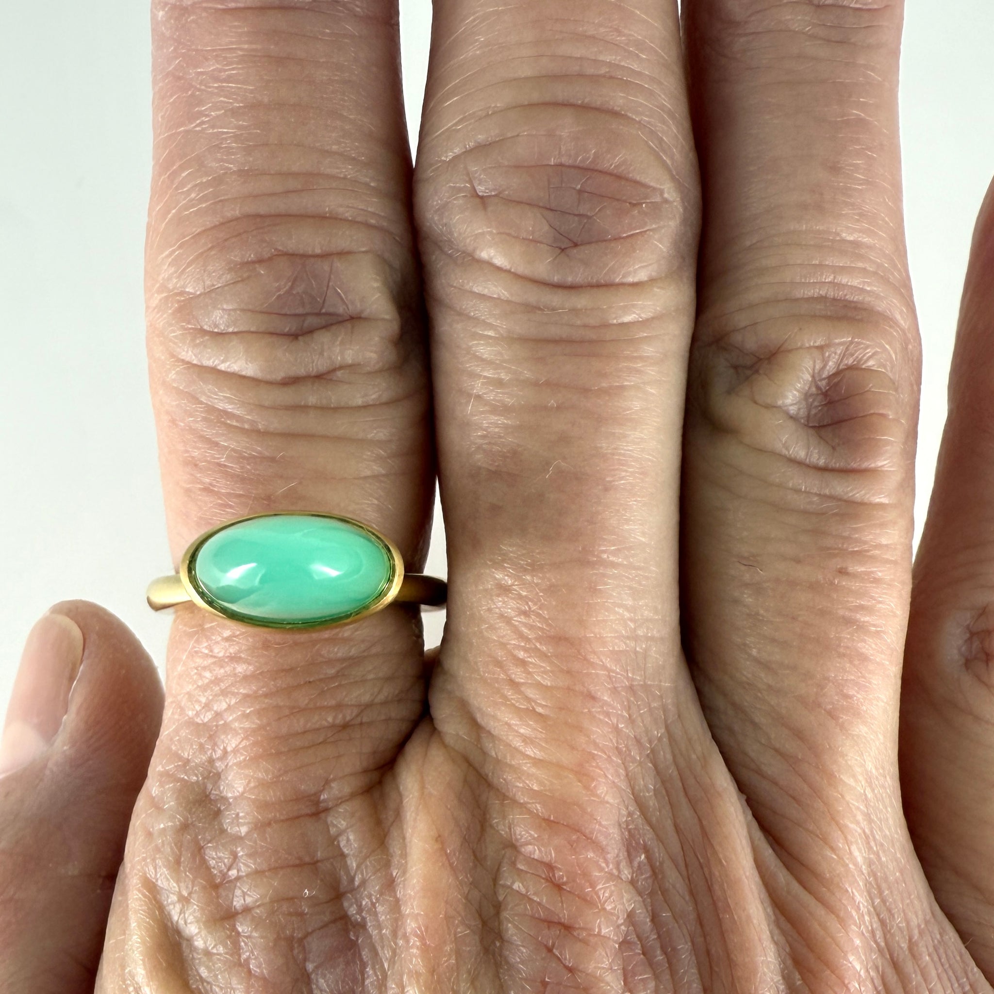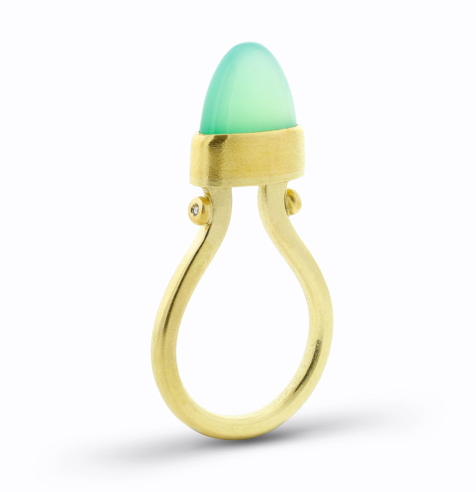 My most regal ring of all showcases a custom cut Australian chrysoprase cabochon. A modern Etruscan inspired design. The intensely translucent, apple green hue radiates from the warm, high carat gold. Dramatic. Elevated. Perfection. From the Carol Greiwe Luxe Collection…